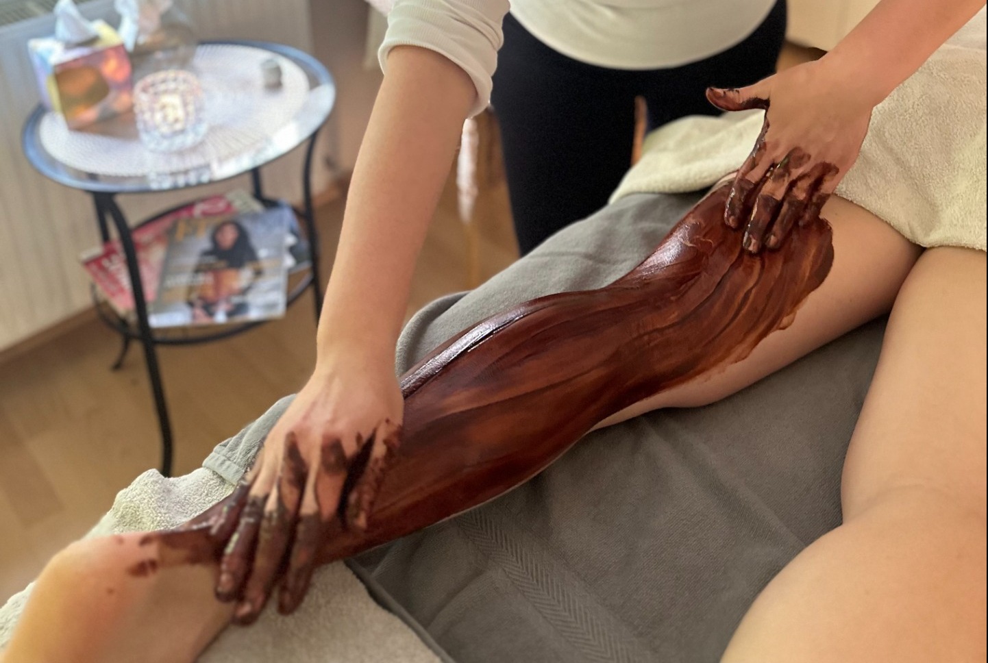 Nasleduje pomalá masáž jemnou čokoládou, pri ktorej sa masírujú krk, ramená,